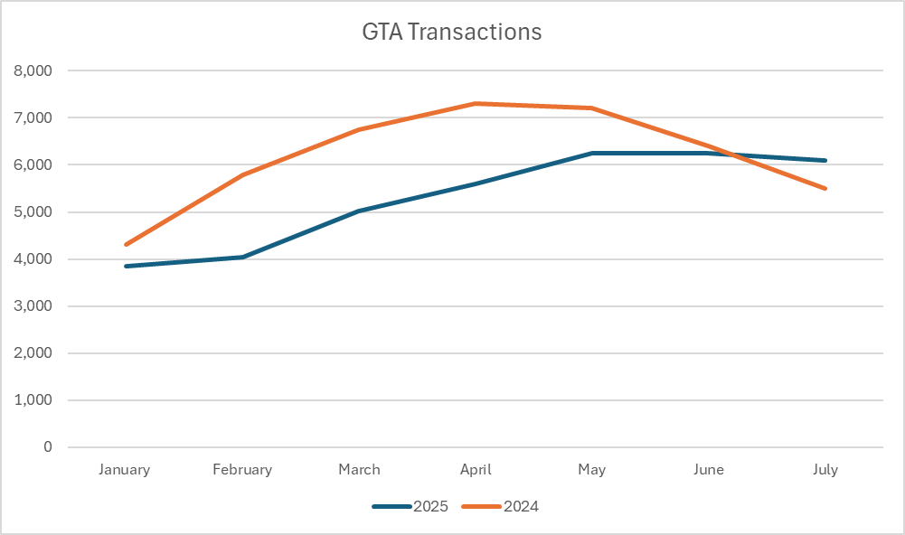 According to the Toronto Regional Real Estate Board (TRREB), home sales rose 3.8% in July compared to June, and were up 10.9% compared with July 2024. In fact, GTA experienced the best home sales result for the month of July since 2021. Sales were also up relative to listings, suggesting a modest tightening in the market compared to last year.